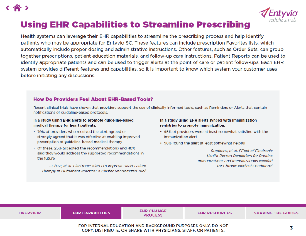 Key pages from a training guide created to educate the field sales team about electronic health record (EHR) capabilities and provide talking points to highlight the value of using health IT resources to implement EHR changes.