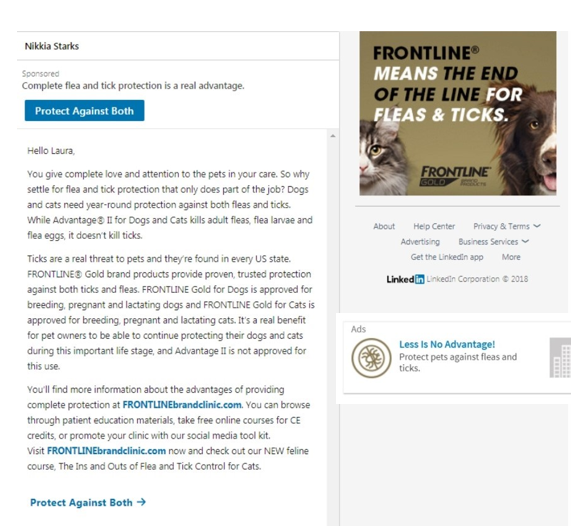 LinkedIn email and ad campaign targeting veterinarians and vet techs. The message emphasizes that FRONTLINE’s dual protection provides a greater advantage than their competitor, ADVANTAGE II.